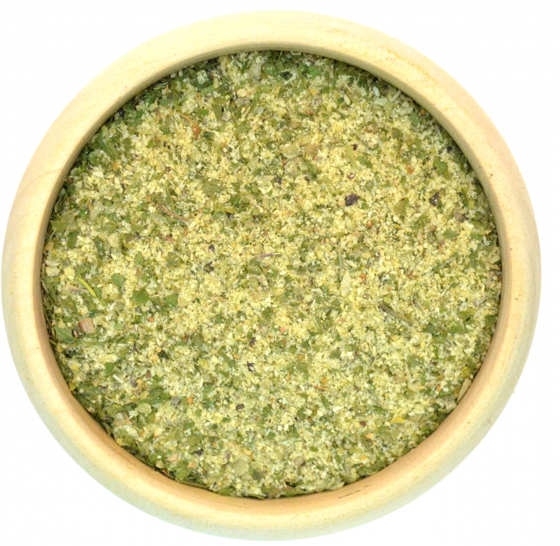 Zutaten: Zwiebeln, Petersilienblätter, Pfeffer, Meersalz, Majoran, Maisstärke, Aroma (enthält: WEIZEN), SENFMEHL, Sonnenblumenöl, Curcuma. (kann Spuren von Sesam, Sellerie und Mandeln enthalten)