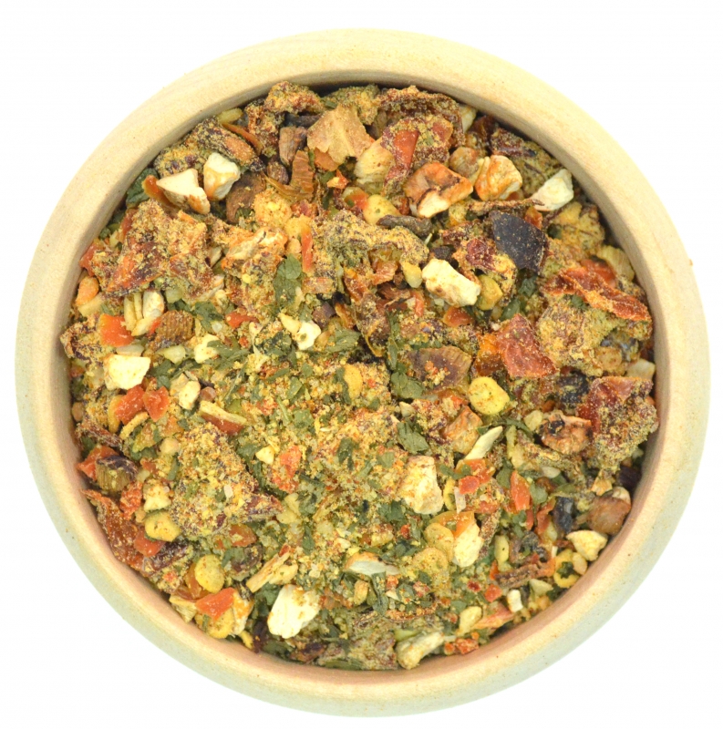 Zutaten: Chillies, Knoblauch, Tomaten, Karotten, SELLERIEBLÄTTER, Meersalz, Mischpilzgranulat (Steinpilze, Butterpilze, Champignons), Meersalz, Maisstärke, Aroma (enthält: WEIZEN), Zwiebeln, SENFMEHL, Sonnenblumenöl, Curcuma. (kann Spuren von Sesam und Mandeln enthalten)
