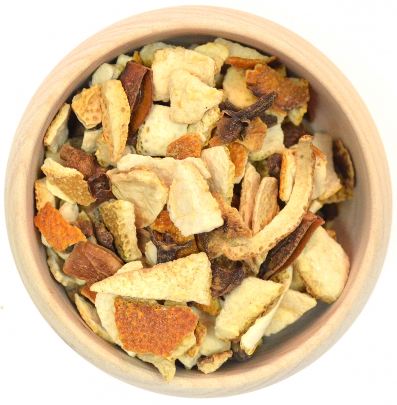 Zutaten: Orangenschalen, Zimtrinde, Zitronenschalen, Nelken, Stern-Anis, Fenchel. (kann Spuren von Senf, Sesam, Sellerie, Gluten und Mandeln enthalten)