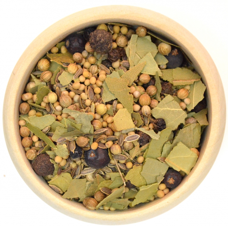 Zutaten: SENFKÖRNER, Dillsaat, Koriander, Pfeffer, Lorbeerlaub, Kümmel, Wacholderbeeren, Piment, Nelken, Bohnenkraut. (kann Spuren von Senf, Sesam, Sellerie, Gluten und Mandeln enthalten)