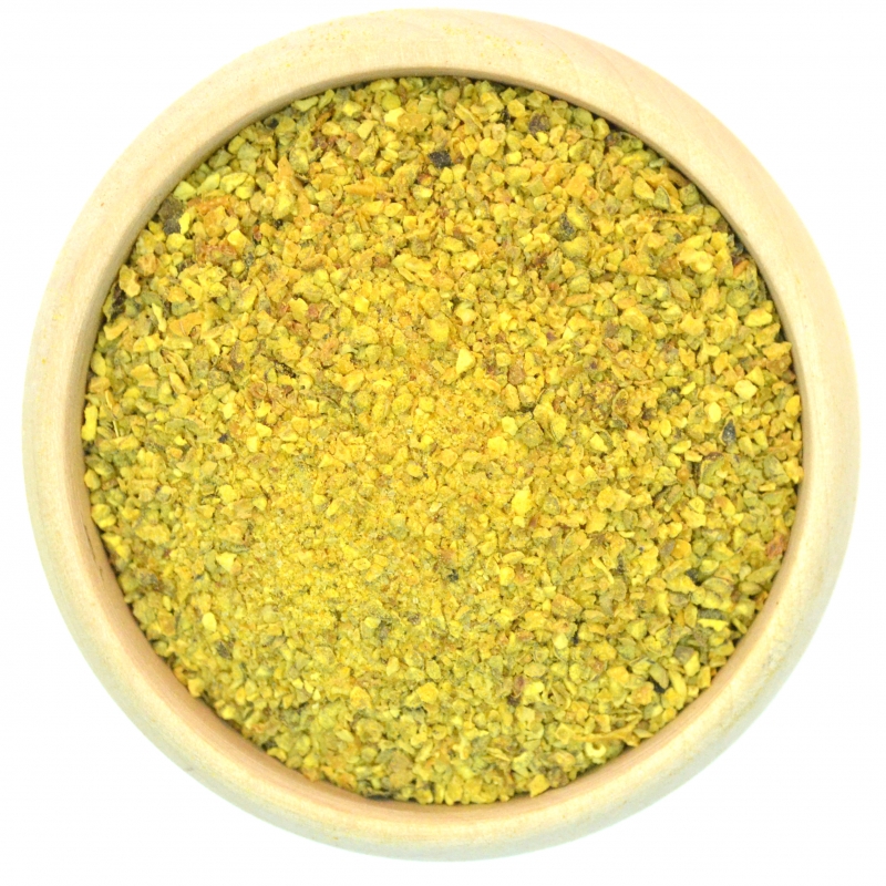 Zutaten: Orangenschalen, Pfeffer, Ora-Perl (Aromaextrakte, Süßlupinenmehl, Zucker, Fruchtzuckersirup), Zucker, Curcuma. (kann Spuren von SENF, SESAM, SELLERIE, GLUTEN und MANDELN enthalten)
