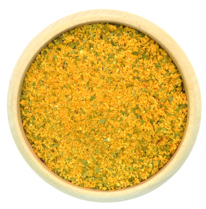 Zutaten: Zwiebel, Curcuma, Paprika, Pfeffer, Knoblauch, Petersilie. (kann Spuren von SENF, SESAM, SELLERIE, GLUTEN und MANDELN enthalten)