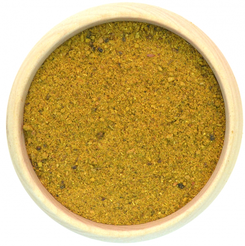 Zutaten: Koriander, Curcuma, Pfeffer, Paprika, Cumin, Zimt, Ingwer, Piment, Cardamom, Anis, Muskatnuss, Nelken, Chillies, Kümmel, Galgantwurzel, Lorbeerblätter. (kann Spuren von SENF, SESAM, SELLERIE, GLUTEN und MANDELN enthalten)