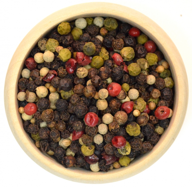 Zutaten: Pfeffer (schwarz, weiß, grün), Koriander, Rosa Beeren (Schinus Terebinthifolius). (kann Spuren von Senf, Sesam, Sellerie, Gluten und Mandeln enthalten)